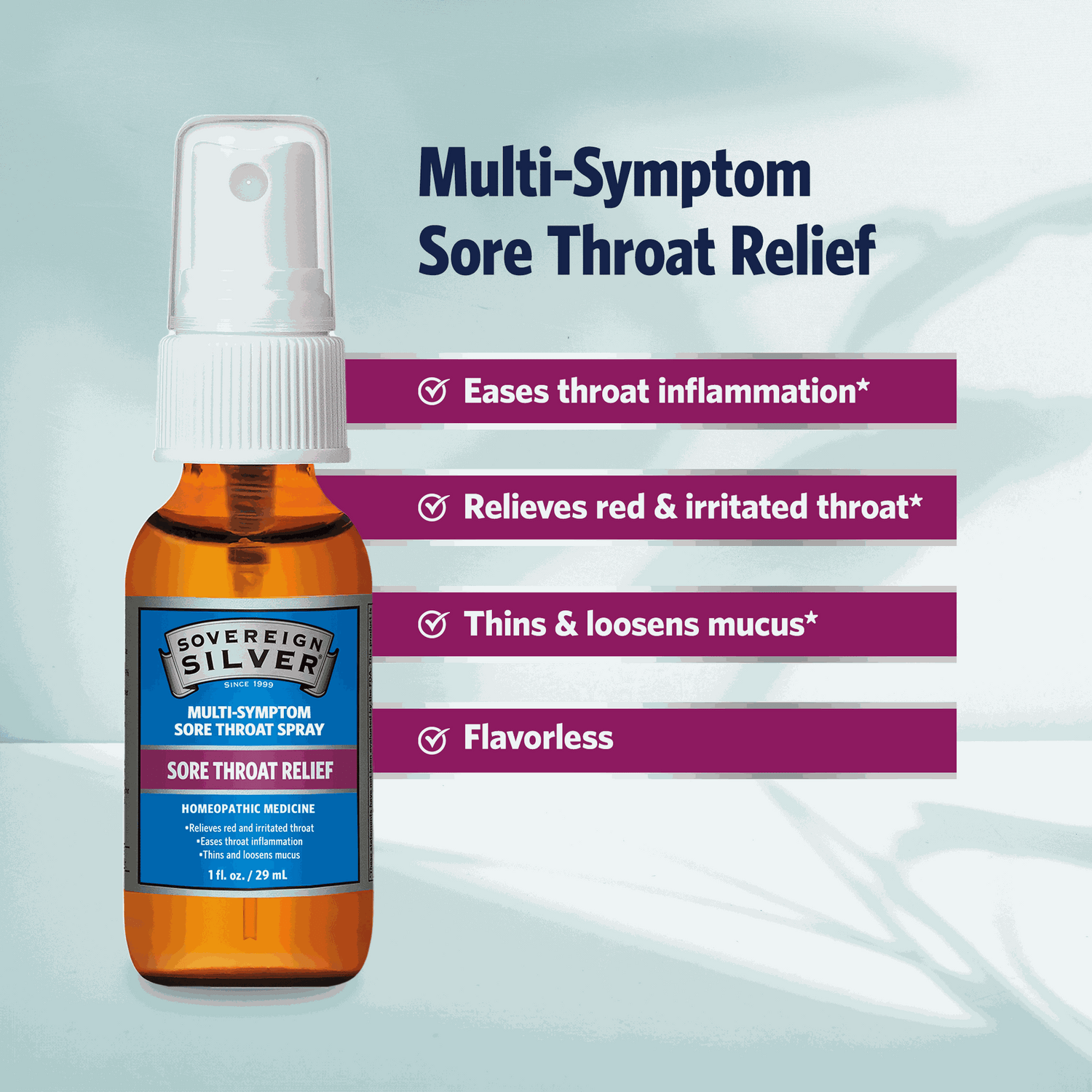 Sovereign Silver Multi-Symptom Sore Throat Spray is an effective, homeopathic medicine. It’s specifically formulated to relieve minor throat inflammation and hoarseness due to coughs, colds and voice overuse. Relieves redness, irritation, and eases minor throat inflammation, while thinning and loosening mucus. Enjoy soothing relief without the numbing sensation.